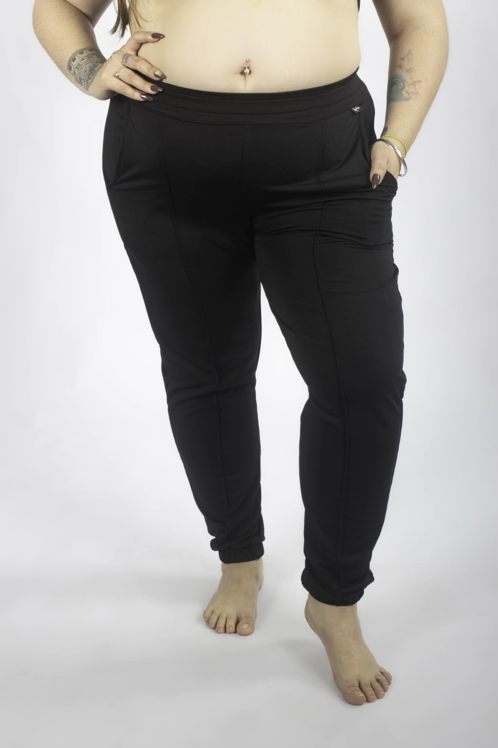 Tiro alto. Con bolsillos y puño en los tobillos.